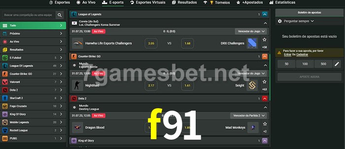 O f91 oferece uma grande seleção de opções de apostas em e-sports com probabilidades competitivas